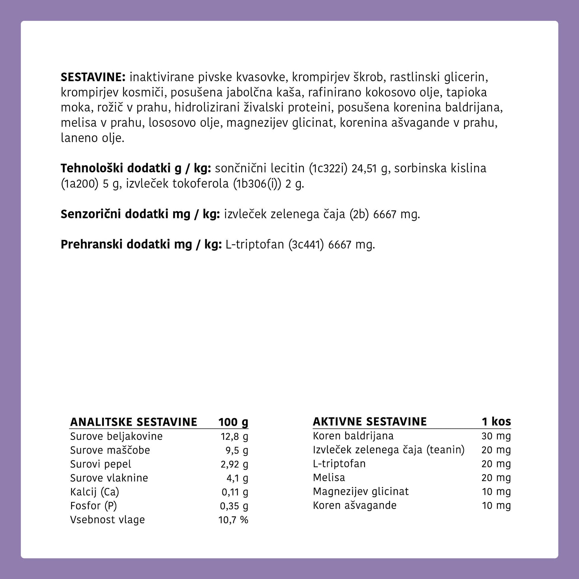 INGREDIENTS: inactivated brewer's yeast, potato starch, vegetable glycerin, potato flakes, dried apple pulp, refined coconut oil, tapioca flour, carob powder, hydrolyzed animal proteins, dried valerian root, lemon balm powder, salmon oil, magnesium glycinate, ashwagandha root powder, linseed oil.