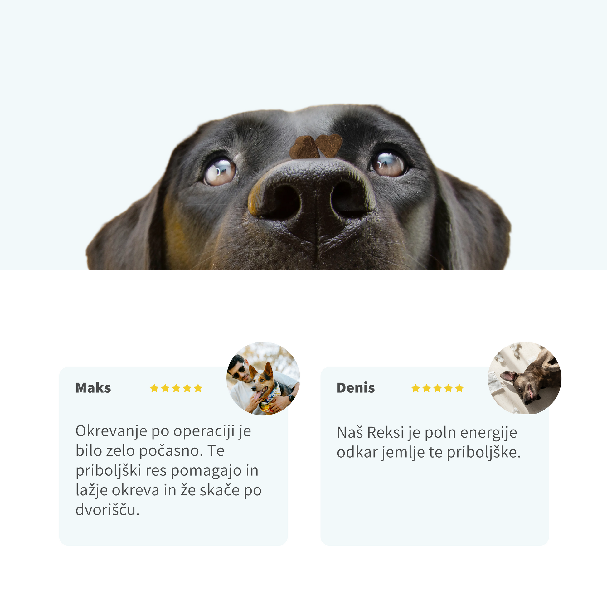 Naši priboljški za pse so zasnovani tako, da podpirajo zdravje sklepov in vezivnega tkiva ne le ob težavah, temveč tudi preventivno. Redna in dolgoročna uporaba zagotavlja stalno podporo gibljivosti, vitalnosti ter splošnemu dobremu počutju vašega psa. Ker temeljijo na naravnih, preverjenih sestavinah, so primerni za vsakodnevno uporabo in varni za dolgotrajno dodajanje k prehrani.