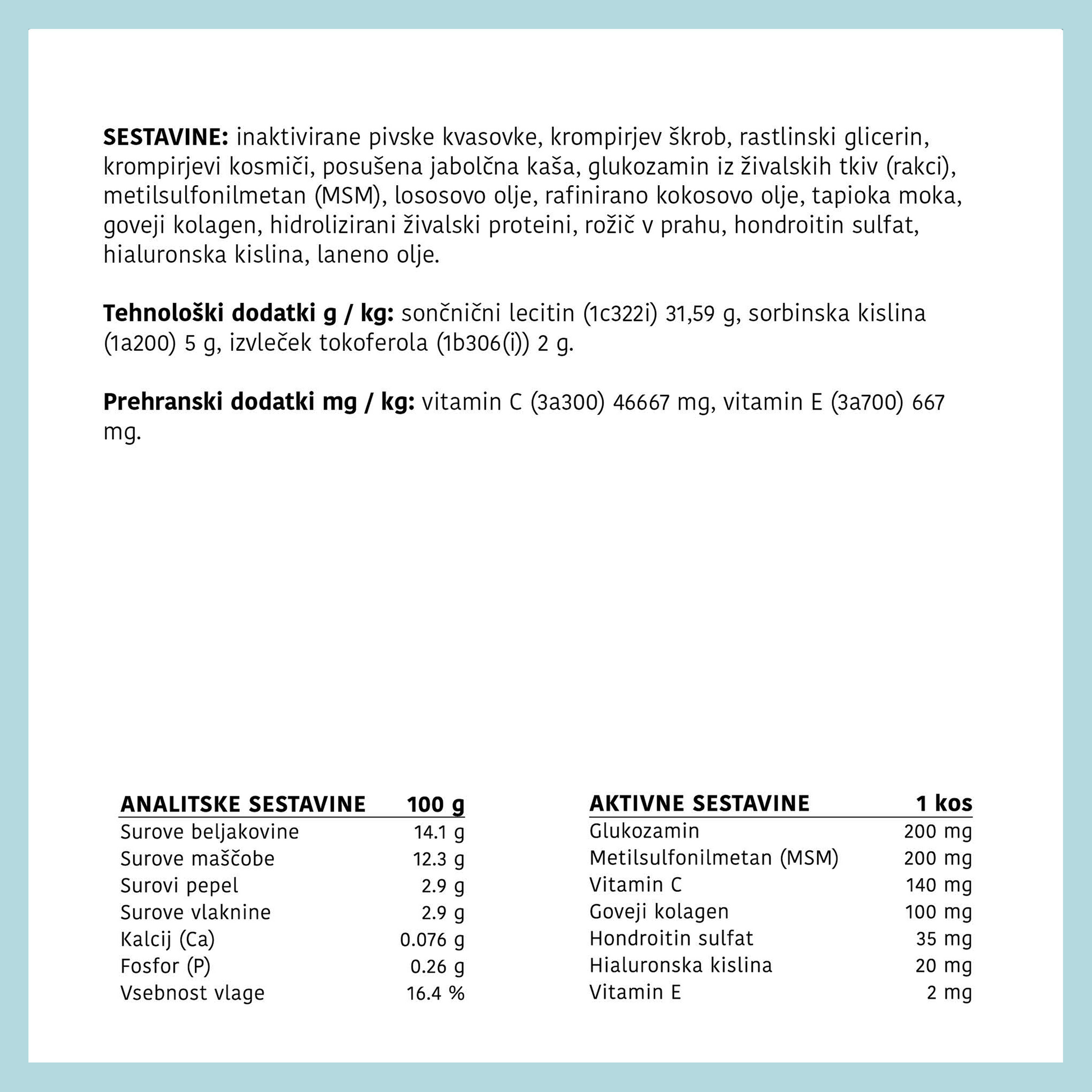 SESTAVINE: inaktivirane pivske kvasovke, krompirjev škrob, rastlinski glicerin, krompirjevi kosmiči, posušena jabolčna kaša, glukozamin iz živalskih tkiv (rakci), metilsulfonilmetan (MSM), lososovo olje, rafinirano kokosovo olje, tapioka moka, goveji kolagen, hidrolizirani živalski proteini, rožič v prahu, hondroitin sulfat, hialuronska kislina, laneno olje.