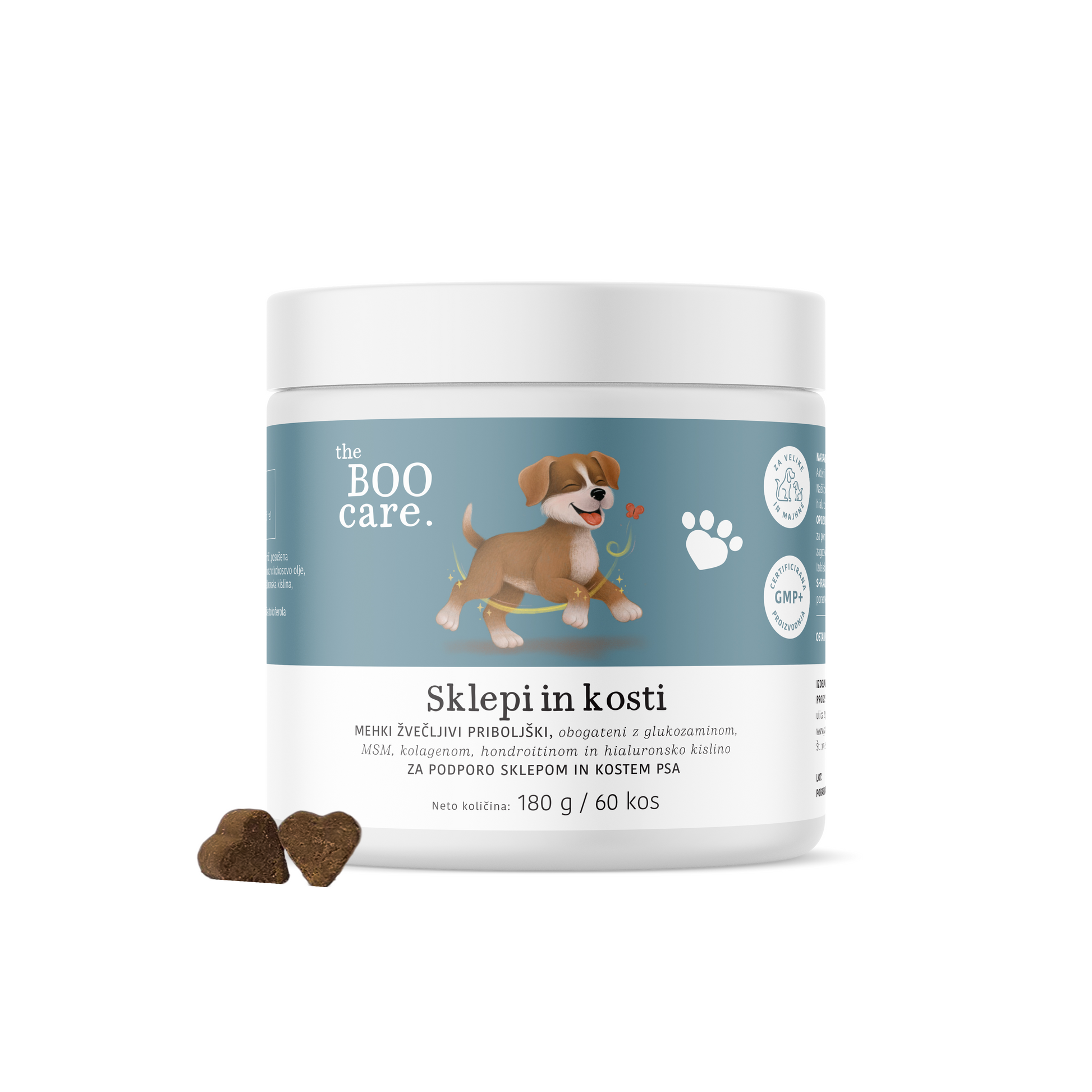 The Boo Care priboljški Sklepi in kosti so naravni, napredni pasji dodatki, zasnovani za podporo zdravju sklepov, trdnosti kosti, vezivnega tkiva in splošni vitalnosti vašega psa.