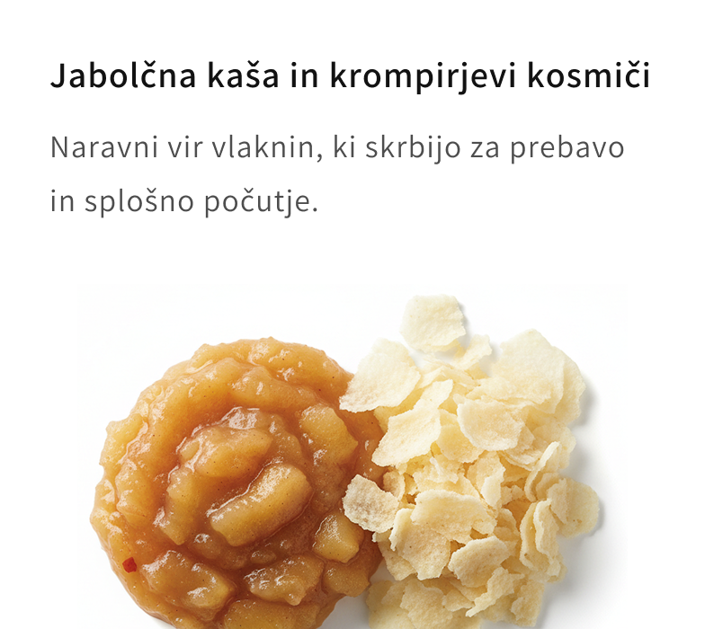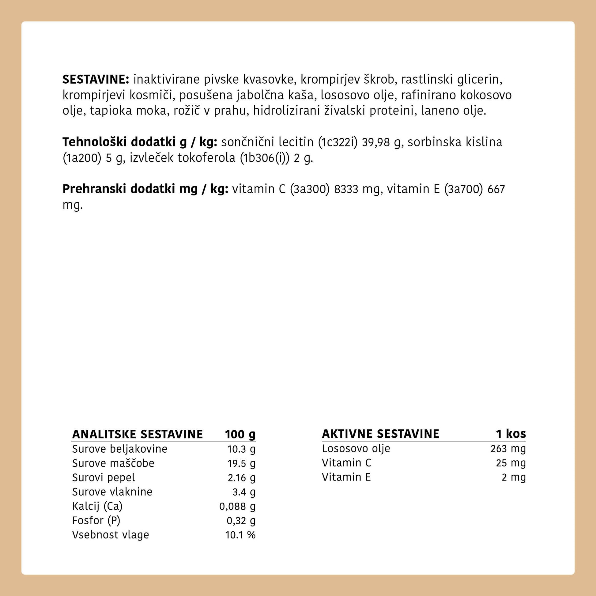 SESTAVINE: inaktivirane pivske kvasovke, krompirjev škrob, rastlinski glicerin, krompirjevi kosmiči, posušena jabolčna kaša, lososovo olje, rafinirano kokosovo olje, tapioka moka, rožič v prahu, hidrolizirani živalski proteini, laneno olje.