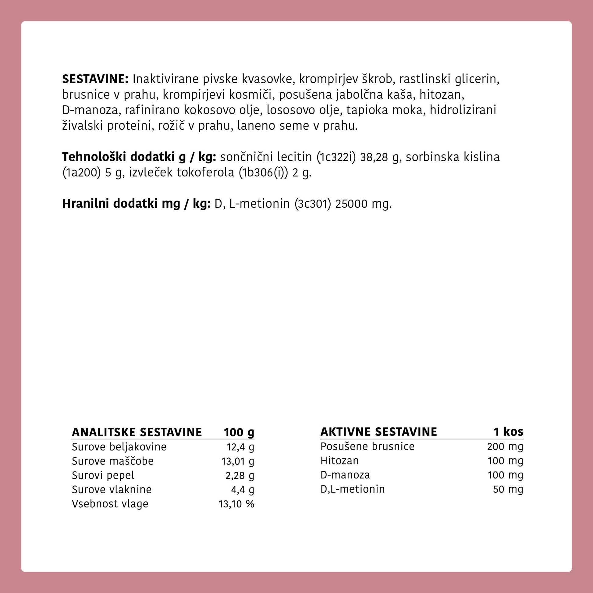SESTAVINE: Inaktivirane pivske kvasovke, krompirjev škrob, rastlinski glicerin, brusnice v prahu, krompirjevi kosmiči, posušena jabolčna kaša, hitozan, D-manoza, rafinirano kokosovo olje, lososovo olje, tapioka moka, hidrolizirani živalski proteini, rožič v prahu, laneno seme v prahu.